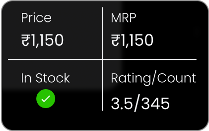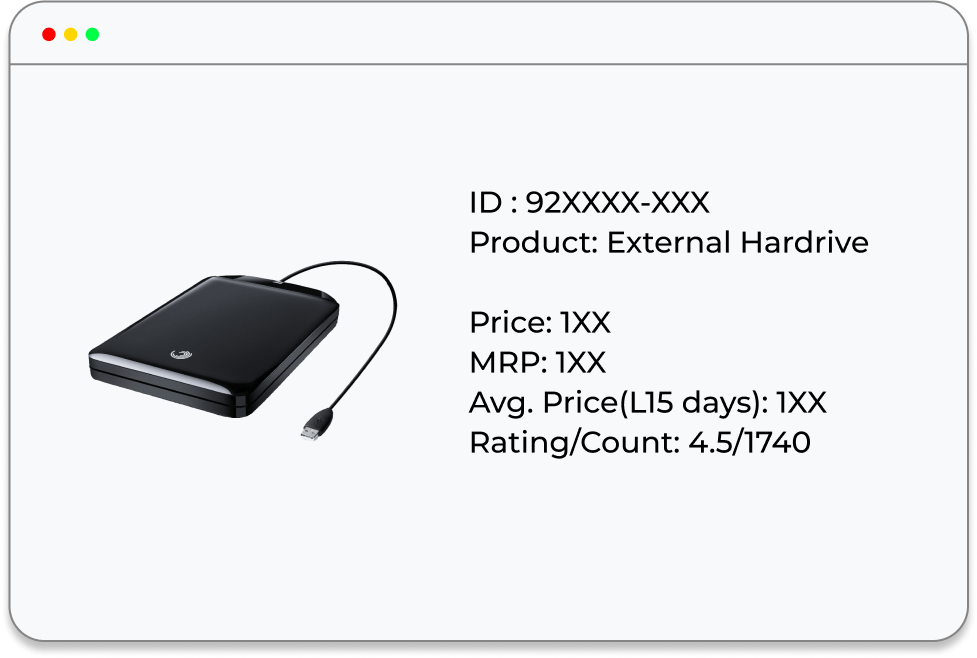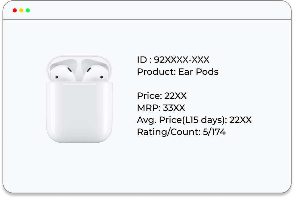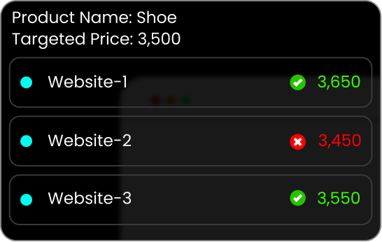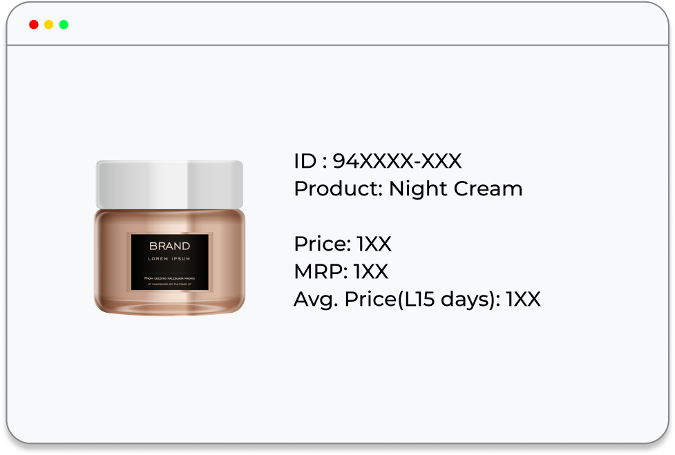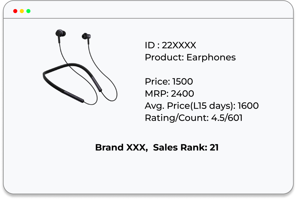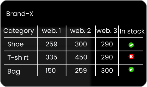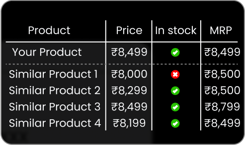 Get easy access to comprehensive market intelligence through real-time monitoring and analysis of price fluctuations on both your website and competitor platforms. We also closely track product availability, price trends, ratings, and more.