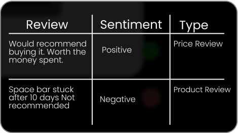 Efficiently categorize customer reviews of your products based on product, price, shipping, website, and delivery to better understand sentiments. Identify products with low ratings, leverage positive feedback to enhance product descriptions and features, and fine-tune your strategies to elevate customer satisfaction and enhance the overall shopping experience.